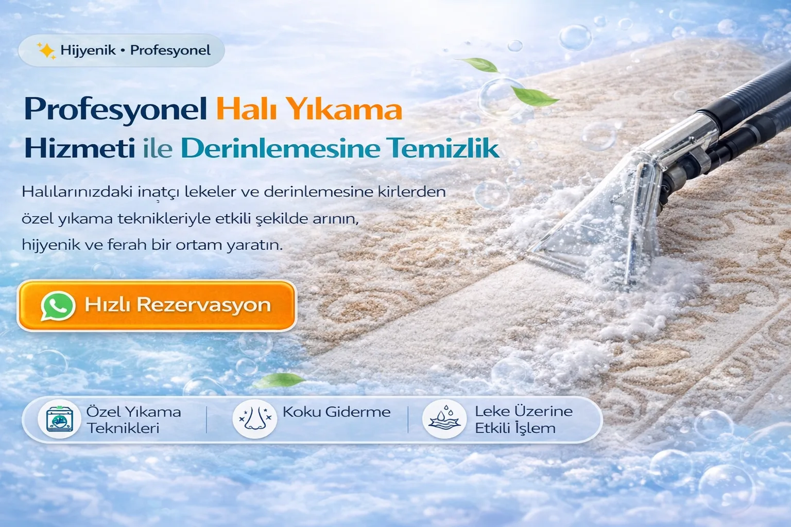 Bizi arayarak veya WhatsApp üzerinden yazarak hızlı şekilde halı yıkama talebinizi oluşturabilirsiniz.