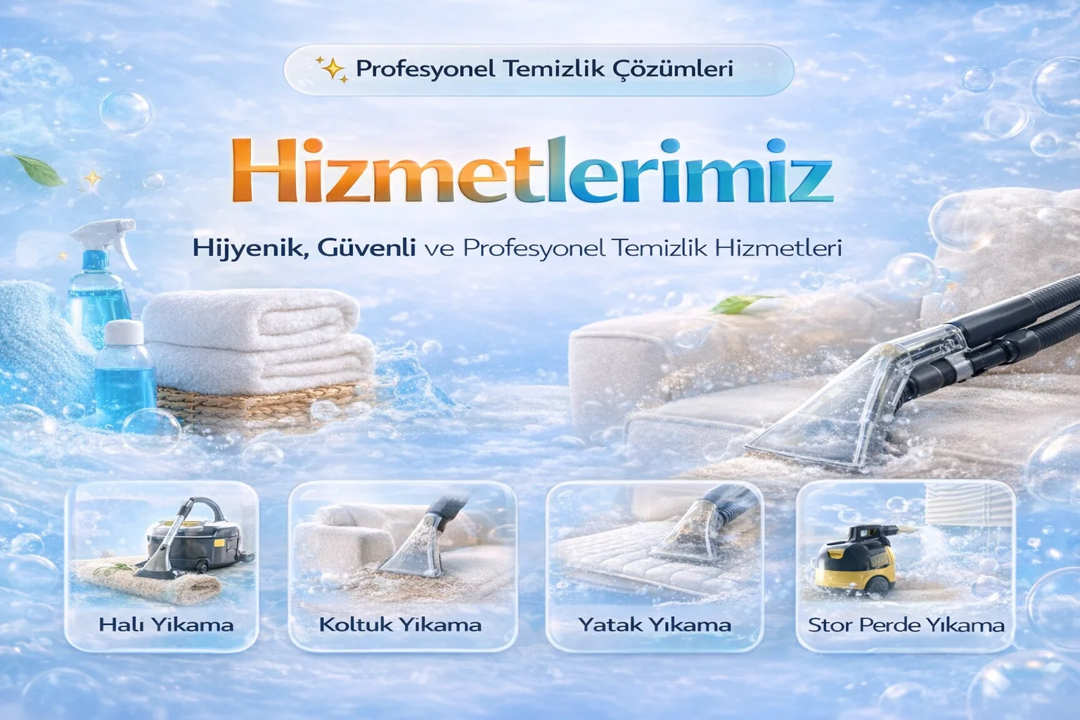 Halı yıkama, koltuk yıkama, yatak yıkama, stor perde yıkama, battaniye yıkama ve yorgan yıkama hizmetlerimizi profesyonel, hijyenik ve güven veren hizmet anlayışıyla sunuyoruz. Aşağıdaki hizmet kartlarından dilediğiniz sayfaya doğrudan geçebilirsiniz.