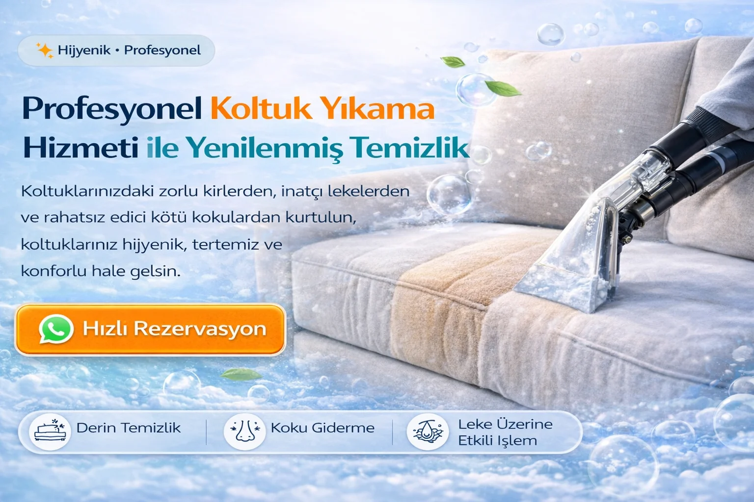 Bizi arayarak veya WhatsApp üzerinden yazarak hızlı şekilde koltuk yıkama talebinizi oluşturabilirsiniz.